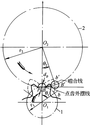 如图1所示,为外啮合销齿传动的工作原理图。设1、2两轮的节圆外切于节点P。在轮2节圆圆周上取一点B,使其起始位置重合于节点P,而设想两轮各绕其中心O1、O2按图中箭头所示方向作相对纯滚动,当轮1转过θ1角而轮2相应地转过θ2角时,B点则达到图中的B' 点位置。下面讨论B点的运动轨迹:因B点系属于轮2节圆圆周上的一点,就其绝对运动轨迹来说,即为与该圆圆周相重合的一圆弧;而就其相对于轮1的相对运动轨迹来说,则为一外摆线bb'。今把B点视为轮2(销轮)上直径等于零的一个销齿(称为点齿),而把外摆线bb' 作为轮1(齿轮)上的一齿廓,那么,它们就构成了一对理论上的销齿传动,称为点齿啮合传动。如果使两轮按上述相反的方向转动,则可得到另一条与bb' 反向的外摆线Bb',于是bb' 与Bb' 即构成齿轮上的一个点齿啮合齿形(如图虚线所示)。显然,当点齿啮合传动时,其啮合线是与轮2的节圆圆周相重合的一段圆弧,此外,两圆应为定传动比传动