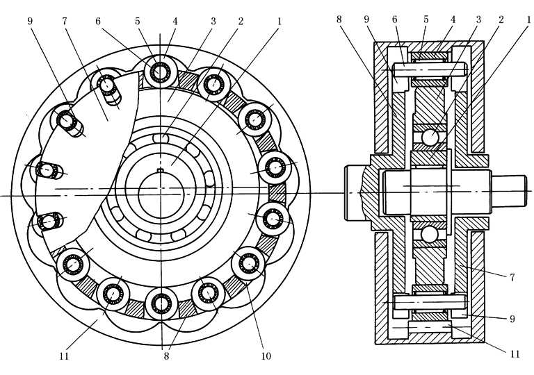 ORT传动的基本结构简图 1—偏心轮(偏心圆盘);2—滚动轴承;3—激波盘;4—圆套筒形滚轮; 5—滚针轴承;6—销轴;7—传力盘;8—活齿盘;9—径向销轴槽;10—滚轮槽;11—固齿齿轮 上图中,偏心圆盘1固定在输入轴上,激波盘3用滚动轴承2装于偏心圆盘1上,组成激波器J。圆套筒形滚轮4、滚针轴承5和销轴6组成活齿。活齿架由活齿盘8和传力盘7连接而成,活齿销轴6的两端支承在活齿架上的径向槽9中可沿径向滚动。一组活齿装于活齿架上组成活齿齿轮H。固齿齿轮G固定在壳体上,与激波器J和活齿齿轮H同心地安装于同一轴线上。固齿齿轮的齿廓做成活齿由偏心圆激波器以nj转速驱动,固齿齿轮按ng=nj/i转速转动时活齿滚轮的包络曲线制作 设激波器J的转速为nj,活齿齿轮H的转速为nh,固齿齿轮的转速为ng。根据相对运动原理,用转化机构法,可求得三构件之间的运动关系