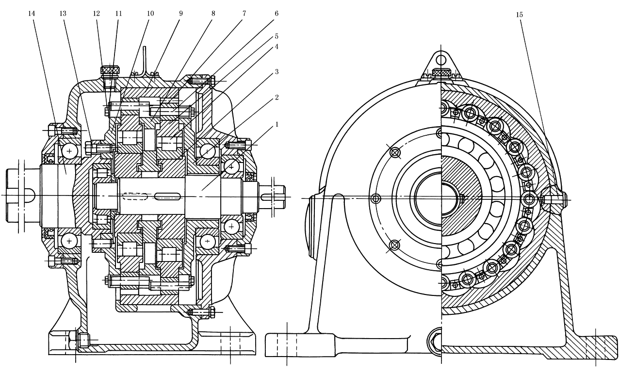 通用ORT活齿减速器的典型结构 1—输入轴;2,10—右、左传力盘;3—偏心轮;4—滚动轴承;5—激波盘;6—销轴;7—圆筒形滚轮(6和7组成活齿); 8—活齿盘;9—固齿齿轮;11—垫圈;12,13—螺钉;14—输出轴;15—销钉 |