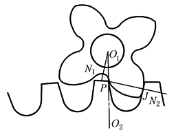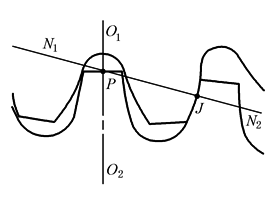 图2 双点线啮合齿轮传动 3)少齿数点线啮合齿轮传动。这种传动的小齿轮最少齿数可以达2~3齿,因而其传动比可以很大,如图3所示
