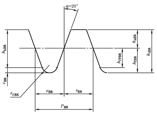 cBR——顶隙 hfFBR——齿根直线段齿廓高 rfBR——齿根圆弧半径 eBR——齿槽宽 hkBR——工作齿高 sBR——齿厚 haBR——齿顶高 htBR——全齿高 α——齿形角 hfBR——齿根高 PBR——齿距 |