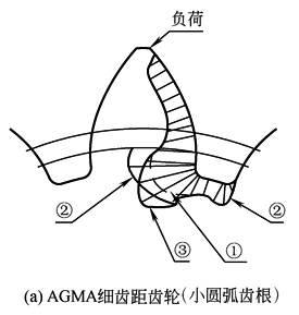 滚切成形的齿轮(或EDM用电极)齿根曲线,是由延伸渐开线所形成的齿根圆角,主要取决于滚刀齿顶两侧的圆角半径。齿顶圆角半径愈大,则齿轮齿根处延长渐开线的曲率半径也愈大,所形成的“圆角”的曲率半径也就大。当载荷施加于轮齿齿顶上时,在齿根圆角处所产生的弯矩最大。在较小的齿根圆角周围所形成的应力集中,会增大弯曲应力。齿根圆角半径越大,这种应力集中便越小,轮齿承受施加载荷的能力便越强。齿轮传动属于典型的反复载荷,齿根圆角越大的特点更加适用这类反复载荷的传递 由齿条型刀具按展成原理,所滚切成形的齿轮齿根圆角延长渐开线(在ANSI/AGMA 1006-A97中称“次摆线”),其曲率半径变化范围从齿根曲线底部的最小,至与渐开线齿侧衔接处的最大,如图c所示。当齿数较少和齿厚较小的齿轮,这一变化十分明显。所有由齿条型刀具展成滚切的齿轮齿根圆角曲线,均存在这一现象,只是大小程度不同而已。采用圆弧来替代齿根圆角延伸渐开线,对齿轮型腔制造工艺(线切割编程)或齿根圆角的检验和投影样板绘制均有好处。须注意的是这种代用圆弧,不要使齿根圆角处的材料增加至足以引起与配对齿轮齿顶发生干涉的程度。另一方面,在齿根圆角危险截面处过小的圆弧半径,会降低轮齿的弯曲强度。还可以采取两段不同半径的光顺相接圆弧,来替代齿根曲率变化较大的延伸渐开线
