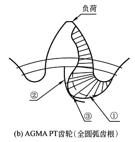 图中对每种齿根圆角分别示出了反映齿根处所产生的应力状况的三个应力分布图。最里面曲线内是“Lewis”的应力图,其应力值是根据Lewis(路易斯)基本方程,不计入应力集中的影响而求得的。中间曲线内是“Dolan和Broghamer”的应力图,计入了应力集中的影响,AGMA标准的齿轮强度计算通常便是对这一影响作出的估算。最外面曲线是“Boundary Eiement Method”的应力图,是采用边界元方法算得的应力。以上三种计算法,由AGMA PT基本齿条标准所确定的齿根圆角,其应力水平都比AGMA细齿距基本齿条标准所确定的齿轮齿根圆角要低 |