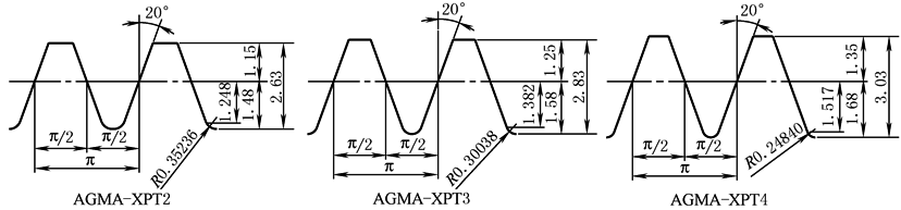 上图是AGMA PT所推荐的三种实验性基本齿条齿廓。它们的主要优点是轮系的重合度可能有所增大,因而对有效中心距变动的适应性较高。但对于齿数少以及增加齿厚来避免根切的齿轮,这一优点又将会受到限制。需适当注意的是全齿高不得增大到引起轮齿机械强度降低的程度,原因不仅在于轮齿过长,还在于齿根圆角半径减小将造成应力集中现象会有所加剧 AGMA PT基本齿条的某些参数会影响轮齿的齿根圆角应力,因而影响轮齿的弯曲强度。从一方面说,AGMA PT齿根高略大,有增大齿根处弯矩的倾向。但是,由于轮齿齿底处的齿厚较宽,会对齿根圆角半径减小所引发的应力集中现象有所减轻。两者所形成的综合效应所带来的有利因素通常会胜过上述程度轻微的有害影响 以上AGMA PT三种实验性基本齿条的参数见下表 |