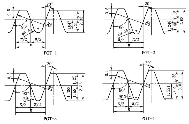 当采用这类实验性基本齿条时,需要将齿顶修缘基本齿条作为塑料齿轮设计图中的组成部分提供给施工者 ANSI/AGMA 1106-A97的附件D中列出了用于这类修形基本齿条对所切成的齿轮齿形有关几何参数的计算公式 将齿顶高度增大与齿顶修缘的组合修形基本齿条,受到塑料齿轮制造业内的广泛重视。上图是参考文献推荐的四种不同型号的模数m=1mm的组合修形基本齿条。这类组合修形基本齿条,实质上即是AGMA PT标准型和三种试验性基本齿条与该标准所推荐的齿顶修缘基本齿条的组合。本章已将原图中英制单位转换为公制单位 |