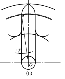 计时仪器用圆弧齿轮齿形,由于分度圆齿厚要比齿根厚度大,如果塑料圆弧齿轮仍按这种标准齿形设计,就会出现以下不良情况:一是轮齿齿根处的弯曲强度最弱;二是轮齿的“限缩”效应会影响模塑齿轮的收缩和顶出脱模。为了避免以上情况出现,图b中推荐一种非标准计时仪器用圆弧齿轮齿形。这种圆弧齿形的主要特点是轮齿的齿根段为非径向直线,它相对标准圆弧齿形的径向直线齿根,已向轮齿体外偏转了一个+γ角。这种非径向直线齿根的金属圆弧齿轮,最早出现在前苏联兵器工业高炮时间控制引信的延时机构中。因为高射炮弹在发射瞬间,要承受极大的瞬时加速度和冲击力,为了增强圆弧齿轮齿根强度,适应极其恶劣的工作条件,特采用了这种非标准圆弧齿轮齿形 圆弧齿轮啮合传动分析研究表明,这种非标准圆弧齿根非径向性齿轮,对其轮系的传动啮合曲线特性的影响甚小,可以忽略不计 |