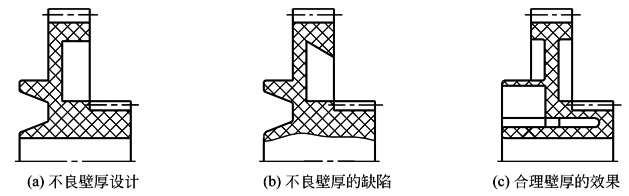 图a各部壁厚差异较大和内角处没有倒圆为不良设计;图b为不良设计注塑成型的塑料齿轮,出现轮缘凹陷,内孔口向内翘曲和模具制造成本较高等缺陷;图c为较好的设计方案。其优点是: 1)塑件各部壁厚基本一致,2)齿轮腹板的结构和位置合理,3)降低了模具的制造成本,4)基本上消除了塑件出现如图b所示的各种不良缺陷 |