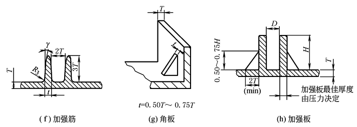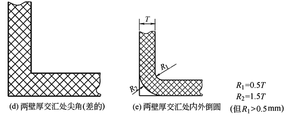 当塑件的两壁交汇成一个内角时,就会出现应力集中和塑胶熔体流动不畅等现象。当将此处型腔两成型面交汇处倒圆时,即可改善塑胶熔体流动的途径,又可使塑件获得比较均匀的壁厚,还可将应力扩散至一较大的区域。通常内角倒圆半径范围为名义壁厚的25%~75%。较大的倒圆半径虽然会减小应力集中,但会使塑件倒圆处的壁厚变大。当内角处有相对应的外角时,即可通过调整外角半径值,就可满足塑件保持一个较均匀壁厚的要求。如图e所示,塑件内角倒圆半径为名义壁厚的50%,则外角倒圆半径取150% |