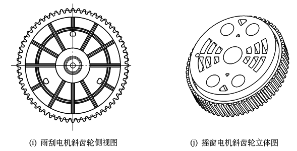 雨刮、摇窗等汽车电机中的塑料斜齿轮的特点是齿宽较厚,直径较大。为了提高齿轮的成型精度和机械强度,通常在齿轮两端面上设置有不同形式的加强筋。如图i为轿车雨刮电机塑料斜齿轮驱动轴一侧端面上的轮缘与轮毂之间,设置了环状和辐射式加强筋。图j为摇窗电机塑料斜齿轮的沉孔和加强筋的设置,其造型美观适用,既减轻塑件重量、增强刚性,提高注塑成型精度和尺寸稳定性,还节约了制造成本。在设计环状和辐射状凸筋时,应保证这类凸筋不会影响斜齿轮的顶出与旋转脱模 |