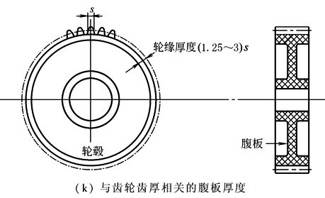 最简单塑料齿轮的基体结构是片状齿轮。这种只有单一名义壁的齿轮,由于没有壁厚变化,从理论上讲将不会有不均匀的收缩。这类齿轮的厚度一般不要超过6mm,当齿轮厚度大于4.5mm时,设计成腹板和轮毂一轮缘式的基体结构,将有利于动力传递的要求 当设计带轮缘—轮毂的塑料齿轮时,必须对齿轮基体结构各个部位的厚度作周密考虑。轮齿的厚度和齿高已经由齿轮的强度要求所决定,困难在于确定齿轮的哪个部分应选作为名义壁,以及它的性能、作用与其他部分之间的关系。齿轮的各个部位按照塑件的基本设计准则,应满足模塑成型的工艺要求。因此,对于任何设计准则,毫无疑问也要作出一些相应的妥协和调整,尽量做到基本满足准则要求 如果将轮齿视为轮缘上的突起部分,则轮缘(或轮毂)的厚度如图k所示,可取齿厚s的1.25~3倍。而腹板和轮毂至少应和轮缘一样厚。由于轮缘—轮毂是设置在腹板上,为了便于塑胶熔体更好的填充和提高齿轮结构的强度,腹板的厚度应该比轮缘更厚一些。但腹板的厚度仍不应超过轮缘厚度的1.25~3倍。为了便于塑胶熔体的填充和减少出现应力集中,应对塑件基体结构上所有内角进行倒圆,倒圆半径为壁厚的50%~75% |