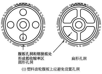 在塑料齿轮的腹板上设计孔洞减轻塑件重量和降低成本的做法应该避免。因为在塑件孔洞周围的表面增加皱纹,并在齿圈上如图l所示,将产生高、低收缩区,使得齿轮齿顶圆直径偏差和圆度误差变大;这种不良的基体结构设计还削弱了齿轮的强度 与上相同的原因,在腹板上的加强筋的设置也会影响齿轮的精度。因此,除了为适应动力传动之需要,应尽量避免。如果必须设置,就应该在齿轮的两侧设置如图m所示的方位刚好对称错开的加强筋,尽量降低塑件高、低收缩区的影响 |