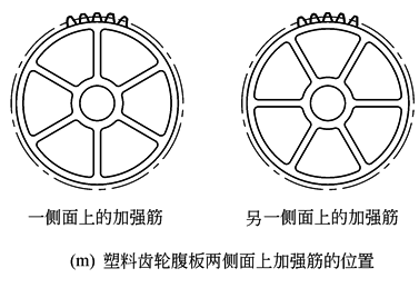 所有齿宽较厚、形状复杂的塑料齿轮,都在名义壁上设置如图f、g、h所示凸筋。塑料齿轮最常见的是加强筋,其目的:一是增强齿轮的刚性和提高塑件尺寸的稳定性;二是控制注入型腔塑胶熔体的流程;三是减轻齿轮的重量,节省材料