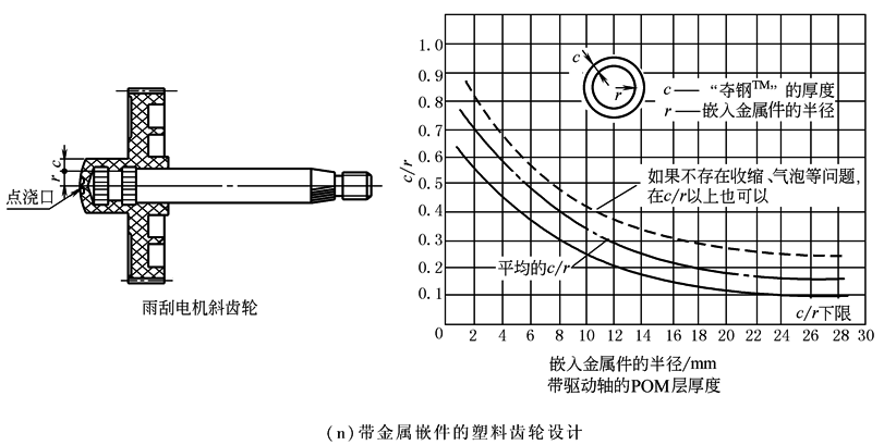 汽车雨刮器的驱动轴,是嵌埋在塑料斜齿轮中的金属嵌件,这类金属嵌件如图n左图所示。在设计带金属嵌件的塑料齿轮结构时,必须注意以下两个结构性问题 |