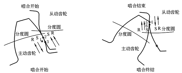 (a)轮齿副在啮合过程中的作用力 在齿轮副传动过程中两轮齿副齿面间相互滚动,同时又相互滑移。一旦轮齿副开始啮合上,即出现初始接触载荷。齿轮的滚动作用把接触应力(是一种特殊的压应力)推进至接触点的正前方。同时,由于齿轮啮合部分的接触长度有所不同,遂发生滑移现象。这样便产生摩擦力,在接触点正后方形成拉伸应力区。图a中“R”的箭头所指为滚动方向;“S”的箭头所指为滑移方向。在两个运动方向相反的区域,合力所引起的问题最多 如左图所示,齿轮副刚好开始啮合。在驱动齿轮上点“1”处,齿轮材料由于向节点方向的滚动作用处于压缩状态;而由于背离节点的滑动运动的摩擦阻力而处于拉伸状态。这两个力的合力能够引起齿面裂纹、齿面疲劳和热积蓄;这些因素都可能引起严重的点蚀 从动齿轮上点“2”处,滚动和滑动为同一方向,朝向节点。这使点2处的材料承受压力(由滚动所致),而点“3”处的材料承受拉力(由滑动所致)。此处的受力状况没有驱动齿轮严重 如右图所示,为这对齿轮副啮合的终结状况。滚动运动仍为相同的方向,但滑动运动改变了方向。现在,从动齿轮齿根承受的载荷最高,因为点“4”同时承受压缩(由滚动)和拉伸(由滑动)载荷。驱动齿轮齿顶承受的应力较前者为轻,因为点“5”处于压应力状态,而点“6”为拉应力状态 在节点处,滑动力将改变方向,出现零滑动点(单纯滚动)。因此,可能会被误认为齿轮在此区段齿面的失效最轻。其实不然,节点区段是发生严重失效情况的首发区域之一。虽然节点处已不见复合应力,但可见较高的单位载荷。在齿轮副开始啮合或终止啮合时,前一对轮齿和后一对轮齿都会承受一定的载荷。因而,单位负载有所降低。当齿轮在节线处或略高于节点处啮合时,即出现最高的点载荷。在这一点上,一对轮齿副通常要承受全部或绝大部分载荷。这就是可能导致疲劳失效、严重热积蓄和齿面损伤的主要原因 齿轮最重要的部分是轮齿。如果无轮齿,齿轮无异就变成摩擦轮,几乎不能用来传递有序运动或动力。齿轮的承载能力,基本上是对其轮齿进行估算的。虽然齿轮的原型试验始终是被推荐的,但是比较耗费财力和时间,因此需要有一种粗略评估齿轮强度的计算方法 |