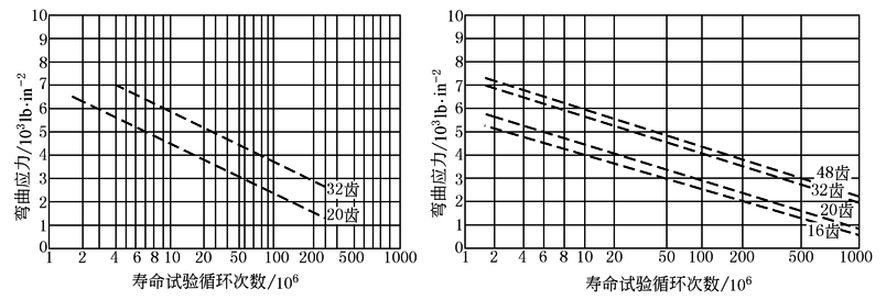 对于各种应力(计算)公式,都可以许用应力Sall来替代Sb以便求解其他变量。安全应力(也即许用应力)并不是数据表中所列的标准应力数值,而是以标准齿形的齿轮进行实际材料试验,而测得的许用应力。许用应力在其数值中已包含了材料安全系数。对任何一种材料,许用应力与许多因素有密切的关系。这些因素包括以下几点:①寿命循环次数,②工作环境,③节圆线速度,④匹配齿面的状态,⑤润滑 因为许用应力等于强度值除以材料的安全系数(Sall=S/n),可以由此推算出齿轮的安全系数。安全系数是指部件在其使用寿命期间,能适应以上各种因素,发挥其正常工效,而不发生失效的能力 安全系数可以有多种不同的定义途径,但基本上是表示所容许的因素与引起失效的因素二者的关系。安全系数可以有以下三种基本应用方式:总安全系数可用于材料性能,如强度;也可用于载荷;或者多个安全系数可以分别用于各个载荷和材料性能 后一种用法常是最有用的,因为可以研究每个载荷,然后用一个安全系数确定其绝对的最大载荷。此后,把各个最大载荷用于应力分析,使得几何尺寸及边界条件得出许用应力。将强度安全系数用于最终使用条件下的材料强度,由此可以确定许用应力极限 载荷安全系数可按惯常方式确定。但是,塑料的强度安全系数难以确定。这是因为塑料的强度不是一个常数,而是在最终使用条件下的一种强度统计分布。因此,设计人员需要了解最终使用条件,例如温度、应变速率和载荷持续时间。需要了解模塑过程,以便掌握熔接痕的位置情况、各向异性效应、残余应力和过程变量。了解材料极其重要,因为对材料在最终使用条件下的性能了解愈清楚,所确定的安全系数愈正确,塑件最终可获得最优的几何尺寸。情况愈是不清楚,未知数愈多,所需的安全系数便愈大。即便对应条件已进行了细致的了解和分析,所推荐的最小安全系数应取为2 如果不掌握预先计算好的许用应力数据,而对塑料来说,通常没有这类数据,则齿轮设计人员必须极其审慎地考虑以上提及的一切因素,以便能够确定正确的安全系数,进而计算Sall。不限于是否有类似的现成经验,仍很有必要建立原型模塑件,在所要求的应用条件下对齿轮进行型式试验。目前有两种常用材料(聚甲醛POM和尼龙PA66),提供有预先计算的许用应力值(见图b)。这两种材料已广泛应用于齿轮,其许用应力也是由供货商所提供的