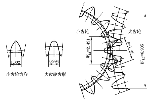 (a) 为了确保齿轮数据计算正确无误,可通过计算机CAD辅助设计软件绘制出齿轮名义齿廓(即齿轮最大实体齿廓)及其啮合图,即可检查轮系的名义啮合侧隙、重合度、齿根宽度以及公法线长度Wk或M值等。在图a中,直接测得的齿轮参数如下 小齿轮:Wk1=2.491,sf1≈1.002,ρf1≈0.221 大齿轮:Wk2=6.905,sf2≈0.994,ρf2≈0.248 轮系名义齿廓重合度:ε≈1.45 轮系最小侧隙:Δ=0.061,节圆处法向侧隙:Δjn=0.107 以上实测结果与调整后的轮系参数“修正计算”所得的数据基本一致;两齿轮的齿根厚度也基本相同 |