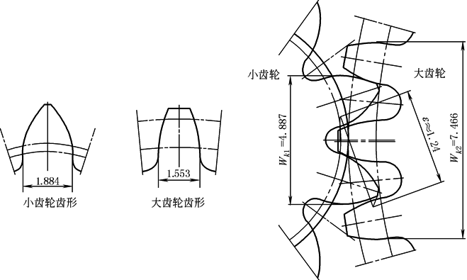(b) 同样可通过计算机CAD辅助设计软件,绘制出两齿轮名义齿廓(即齿轮最大实体齿廓)及其啮合图,即可检查两齿轮轮齿的名义齿廓啮合侧隙、重合度、两齿轮齿根宽度以及Wk、M值等。在图b中,可分别测得如下参数 小齿轮:Wk1=4.887,sf1≈1.884,ρf1≈0.486 大齿轮:Wk2=7.466,sf2≈1.553,ρf2≈0.681 轮系名义齿廓重合度:ε=1.24 轮系最小侧隙:Δ=0.092,节圆法向侧隙:Δjn=0.125 以上实测结果与调整后的轮系参数设计计算所得的齿轮数据基本一致,说明本实例的调整设计计算是可行的 |