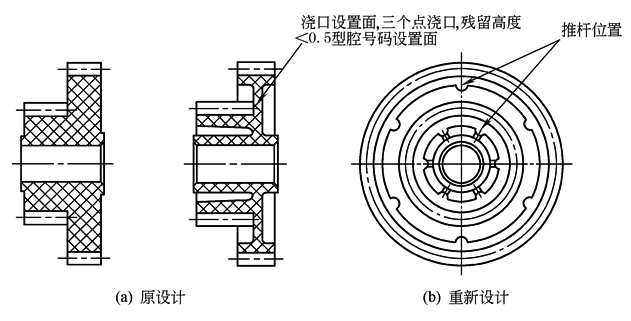 原设计齿轮制品如图a所示。根据塑件模塑成型工艺需要和保证模塑成型质量要求,重新设计的制品结构,如图b所示。在改造设计中主要注意了以下问题 (1)将极不均匀的壁厚尽可能改均匀一些,这样虽然使形状复杂了,但防止缩坑而引起塑件变形和尺寸精度; (2)确定顶出杆的数量、位置,留出足够的顶出面积,要求顶出合力中心与齿轮轴线基本重合,保证塑件顶出顺利; (3)确定浇口位置(3个点浇口)、浇口残留高度等; (4)确定型腔编号的设置面 |