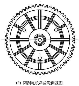 当斜齿轮螺旋角较小时,可考虑采用这种简易脱模方式。如图f所示雨刮器塑料斜齿轮驱动轴一侧端面上,设置了环状和辐射式加强筋,当这些加强筋两侧面的斜度稍大于螺旋角时,采用顶杆直接顶出可使模具结构大为简化。但因顶出力较大,应采用较粗顶杆或推管,以避免制品变形或顶杆弯曲 |