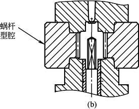 一模一腔齿轮注射模,可将精定位直接设置在定、动模型腔上。图b即为蜗杆型腔与上、下模之间的直接精定位设计 以上两种精定位形式锥型导柱-导套精定位的优点是定位精度高,但在使用中磨损较快,造成定位精度降低。因此,直柱式导杆-导套(单边间隙0.005mm)精定位装置,已在精密注射模中获得应用 |
