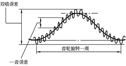 (b)双啮一周误差F"i、一齿误差f "i示意图 左侧标准齿轮和右侧被测齿轮在弹簧的作用下,作无侧隙的啮合转动,两齿轮中心距的变化由千分表示出。被测齿轮转动一周范围内的最大变动量即为双啮一转误差F"i,如图b所示;同时也可测得齿轮的双啮一齿最大误差f "i 在双啮仪上检测渐开线齿轮F"i,需配备模数和压力角与受检齿轮相同的标准齿轮,其精度等级要求比被测齿轮高出国标2~3级 与蜗杆配对啮合的塑料斜齿轮,也可在双啮仪上检测F"i,这时需要用标准蜗杆来代替标准斜齿轮,更能接近蜗杆-斜齿轮的使用状态。但要求对双啮仪进行必要的改装,以便满足标准蜗杆-斜齿轮的交错轴系传动的要求。如果被检测的是蜗杆,可将被测蜗杆与标准斜齿轮视为一对螺旋齿轮,实现对蜗杆进行双啮误差F"i的检测 在双啮仪上测量齿轮、斜齿轮或蜗杆时,可采取手动或电动方式施加旋转运动,双啮误差可目测千分表或通过电测系统数显读数。后者电测化系统具有误差显示、打印和超差报警等多种功能 |