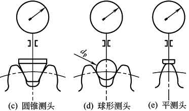 在径跳仪上测量齿轮齿圈径向跳动误差Fr的测头,主要有如图所示三种方式。图c采用锥角为2α的锥形测头与齿槽固定弦接触测量;图d采用球形测头在分度圆处与齿廓接触测量[当变位系数x=0时,球头直径dp=(1.68-0.684x)m];图e采用平测头与齿顶圆接触测量。对于计时仪器用圆弧齿轮和m≤0.5mm的渐开线塑料齿轮,均适宜采用平测头检测齿顶跳动来替代齿圈径向跳动检测。其原因是齿轮型腔要求齿顶圆与齿圈一次加工成型,因此模塑成型的齿轮比较类似于采用顶切法滚齿加工的齿轮 |