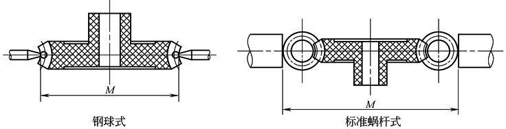 (g)蜗轮M值测量示意图 蜗杆的M值测量,由计算法求得的M值,如图g左图所示,通过两钢球采用测长仪或千分尺进行直接测量。但在生产过程中,可以采用两标准蜗杆代替钢球,如图g右图所示,通过测长仪或千分尺直接测量两标准蜗杆大径间的跨距,来测量蜗轮M值。标准蜗杆参数的设计应保证与蜗轮的无侧隙啮合条件,两标准蜗杆大径之间的跨距M按下式求得: M=d+d'AVG+d"AVG 式中 d——蜗轮分度圆直径; d'AVG——两标准蜗杆分度圆直径实际尺寸的平均值; d"AVG——两标准蜗杆大径实际尺寸的平均值 |
