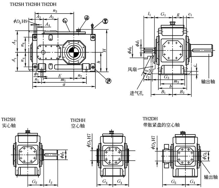 ① d1和d2的公差:d1(和d2)≤f 24mm为k6,f 28mm≤d1(和d2)≤f 100mm为m6,d1(和d2)>f 100mm为n6。 ② 输出轴D2键槽按GB/T1095—2003。 |
