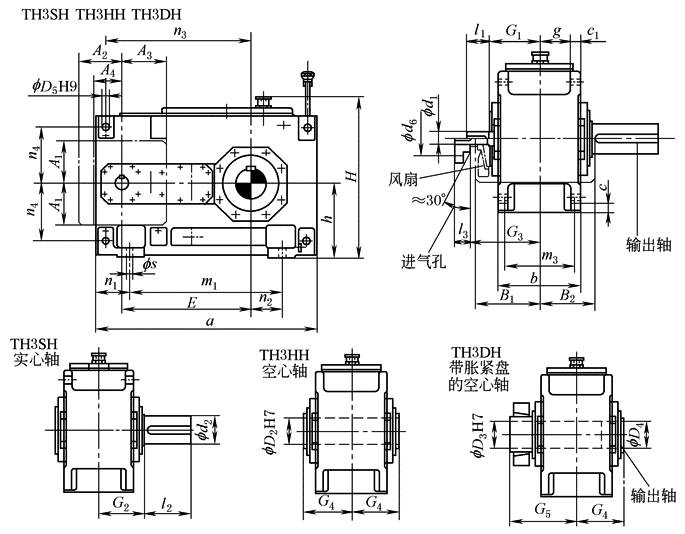 ① d1和d2的公差:d1(和d2)≤f 24mm为k6,f 28mm≤d1(和d2)≤f 100mm为m6,d1(和d2)>f 100mm为n6。 ② 输出轴D2键槽按GB/T 1095—2003。 |