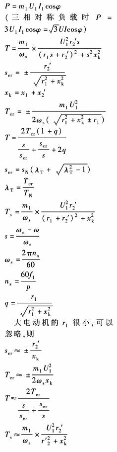 P —— 输入功率,W m1—— 相数 U1—— 定子相电压,V U—— 线电压,V I1—— 定子相电流,A I —— 线电流,A cosφ—— 功率因数 T —— 电磁转矩,N·m r1—— 定子相电阻,Ω r2′—— 折算到定子侧的转子相电阻,Ω x1—— 定子电抗,Ω x2′—— 折算到定子侧的转子电抗,Ω xk—— 短路电抗,Ω s —— 转差率 sN—— 额定转差率 scr—— 临界转差率 λT—— 转矩过载倍数 TN—— 额定转矩,N·m Tcr—— 临界转矩,N·m Ts—— 启动转矩,N·m ω —— 角速度,rad/s ωs—— 同步角速度,rad/s ns—— 同步转速,r/min f1—— 供电频率,Hz p —— 磁极对数 q —— 系数 |