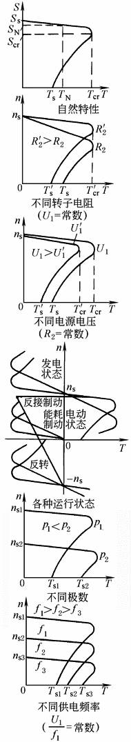 (1)笼型电动机 简单,耐用,可靠,易维护,价格低,特性硬,但启动和调速性能差,轻载时功率因数低。一般无调速要求的机械广泛采用。在可变频率电源供电下可平滑调速。变极数多速电动机为有(或多)级变速调节,且体积大 (2)绕线型电动机 因有滑环,比笼型电动机维护麻烦,价格也稍贵,转子串电阻的特性属软特性,随负载转矩的增加,电动机转速显著下降,但其启动转矩大,启动时功率因数高,且可进行小范围的非连续速度调节,控制设备简单,故仍使用于各种需简单调速的生产机械,如提升机、起重机及轧钢机械等,或电网容量小、启动次数多的机械 |