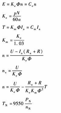E —— 反电势,V Φ —— 磁通,Wb Ke—— 电动机结构常数 Km—— 电动机结构常数 N —— 电枢绕组的导体总数 a —— 电枢绕组的支路对数 Ia—— 电枢电流,A U —— 电枢电压,V T —— 电磁转矩,N·m Ra—— 电枢电阻,Ω R —— 电枢回路附加电阻,Ω TN—— 额定转矩,N·m Tl—— 负载转矩,N·m PN—— 额定功率,kW Ce—— 电动机电势常数 Cm—— 电动机转矩常数 |