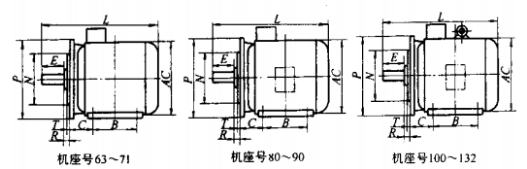 ① G=D-GE。GE的极限偏差对机座号80及以下为 ② K、S孔的位置度公差以轴伸的轴线为基准。 ③ P尺寸为最大极限值。 ④ R为凸缘配合面至轴伸肩的距离。 | ||||||||||||||||||||||||||||||||||||||