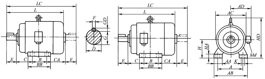 机座带底脚、端盖上无凸缘的安装及外形尺寸(JB/T 9616—1999) mm |