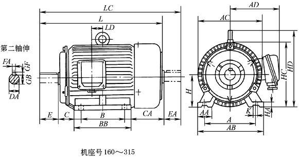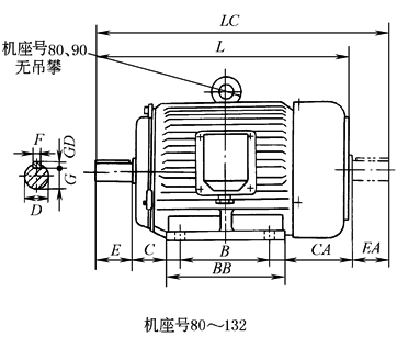 注:1.第二轴伸肩到风罩距离约8mm,表中L、LC等外形尺寸为最大值。 2.轴伸尺寸与第二轴伸尺寸见表B3、B35轴伸尺寸与第二轴伸尺寸。 |