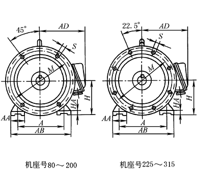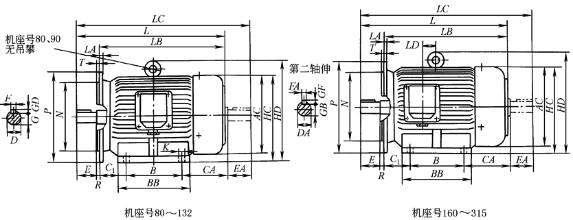 注:1.第二轴伸肩到风罩距离约8mm,表中L、LC等外形尺寸为最大值。 2.轴伸尺寸与第二轴伸尺寸见表B3、B35轴伸尺寸与第二轴伸尺寸。 3.R为凸缘配合面至轴伸肩的距离。 |