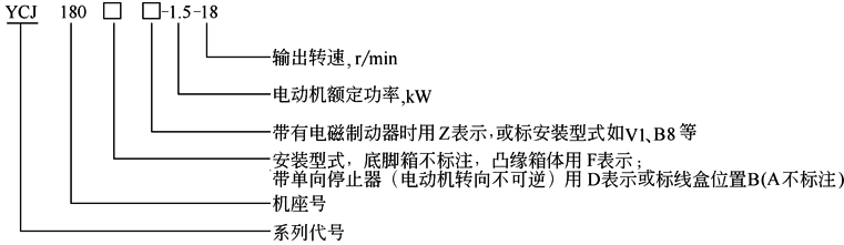 设负载均匀平稳,所需减速电动机的额定功率1.1kW,输出转速为35r/min,每日工作12h,查取技术数据表可选YCJ132-1.1-35。若负载不均匀,有冲击(如驱动螺旋搅拌机等),先取负载性质系数1.25,则电动机功率为1.1×1.25=1.375kW(可取作1.5kW),查技术数据表可选YCJ160-1.5-40。 6.标记示例: