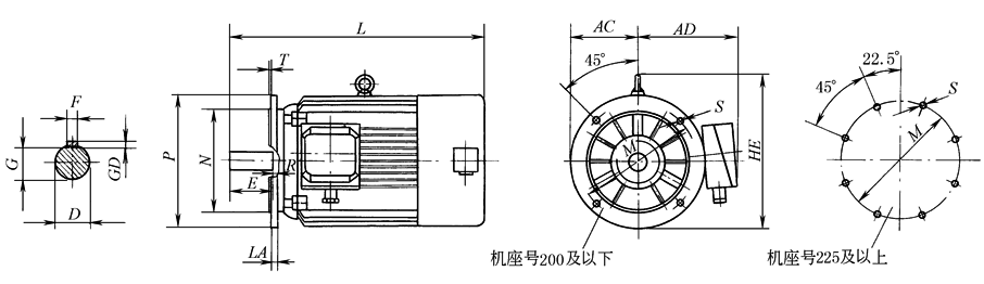 机座无底脚、端盖带凸缘(IMB5、IMV1、IMV3)外形及安装尺寸 mm |