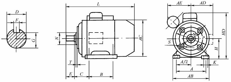 注:1.YS、YU、YY系列仅有机座号90。 2.括号中L和AE(电容器外侧尺寸)为YC系列的值。 3.图中虚线表示侧面出线盒。 4.R为凸缘配合面至轴伸肩的距离。 |