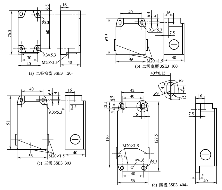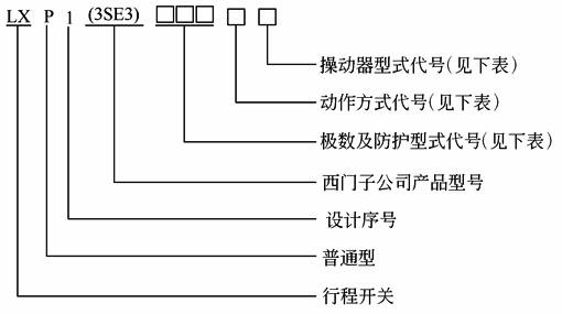 (1) 用途、特点及工作条件 LXP1(3SE3)系列行程开关系引进德国西门子公司技术生产,适用于交流40~60Hz、额定电压至500V,直流额定电压至600V,电流至10A的控制电路中,将机械信号转变为电气信号,用来控制机械动作或作程序控制用。该系列行程开关,分为开启式和防护式两大类,由外壳、触头部分及开关元件所组成。触头结构有多种类型,动作方式可分为瞬动式、蠕动式及交叉从动式三大类。触头部分可在相差90°的四个位置任意安装。工作条件如下:环境温度-40~85℃;相对湿度40℃时不超过50%,最湿月平均最大相对湿度为90%;海拔不超过2000m (2) 主要技术参数 LXP1(3SE3)系列行程开关主要技术参数 |