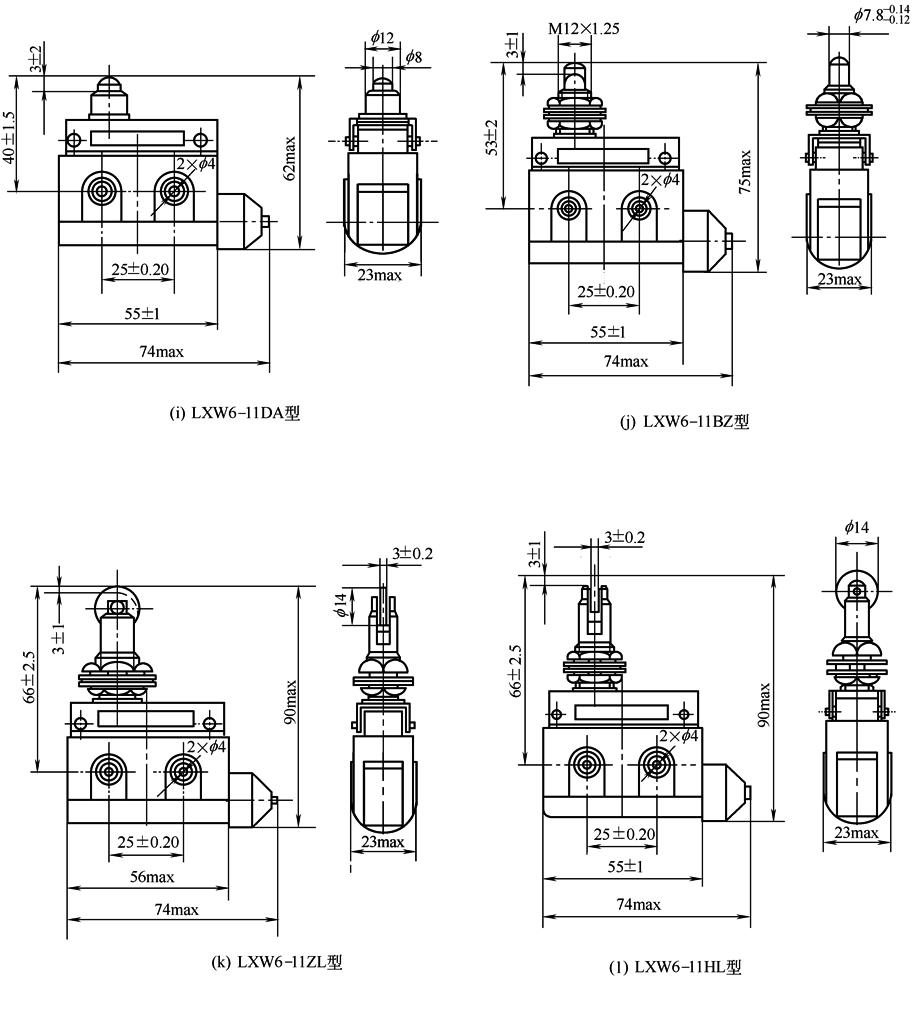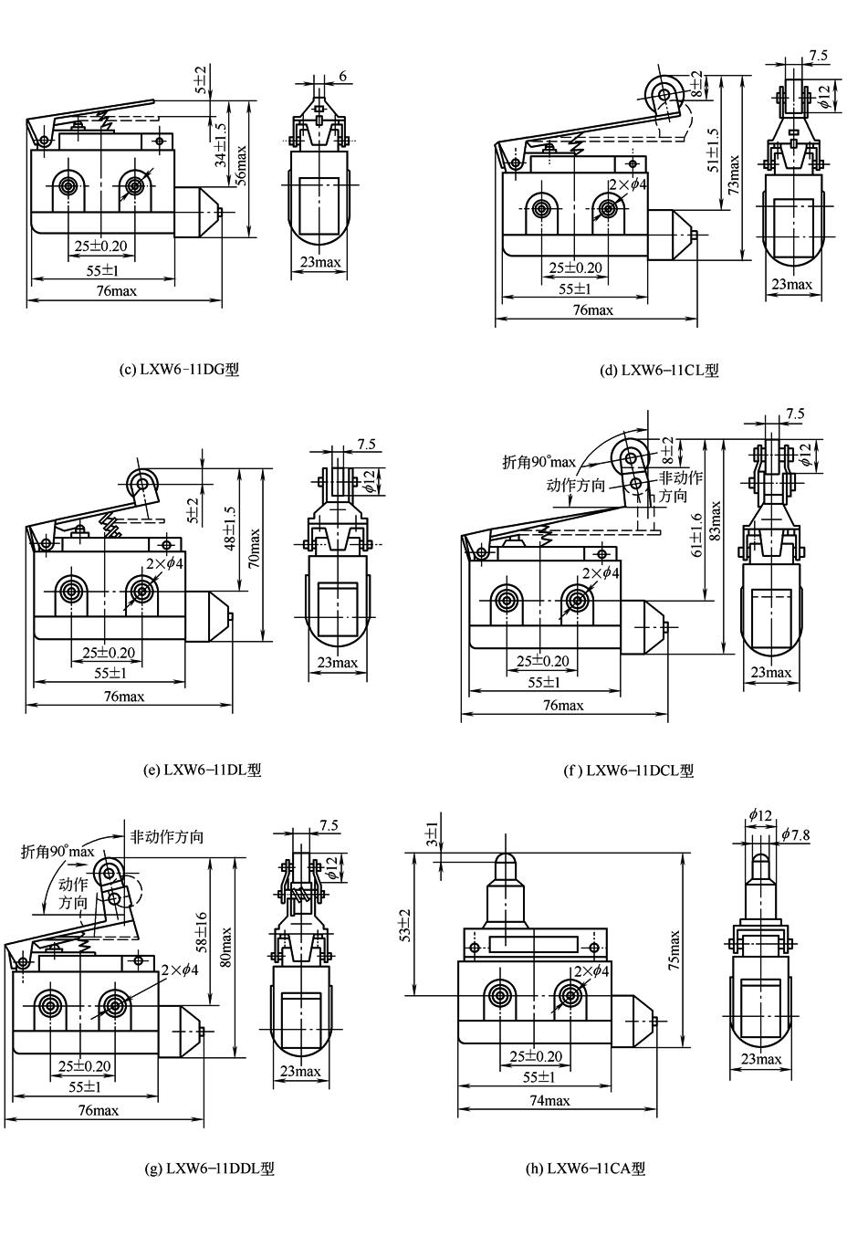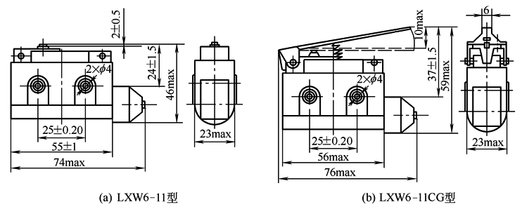(1) 用途、特点及工作条件 LXW6系列微动开关适用于交流50Hz、额定电压至380V及以下的控制电路中,作行程控制或限位保护用。该系列微动开关都具有一常开、一常闭触头,安装方便,密封性好。该微动开关的出线方向可作180°变化 工作条件:环境温度-5~40℃;相对湿度40℃时不超过50%,25℃时不超过90%;海拔不超过2000m (2) 主要技术参数 LXW6系列微动开关主要技术参数 |