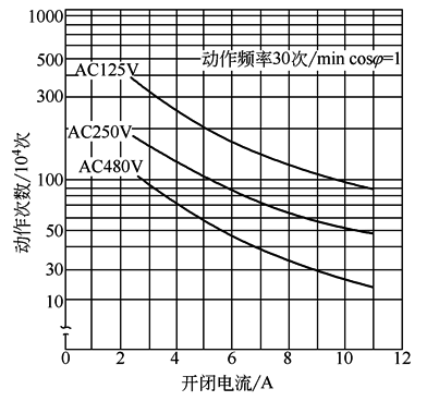 特性曲线 电气寿命曲线(cosφ=1) (环境温度5~30℃,环境湿度40%~70%RH)