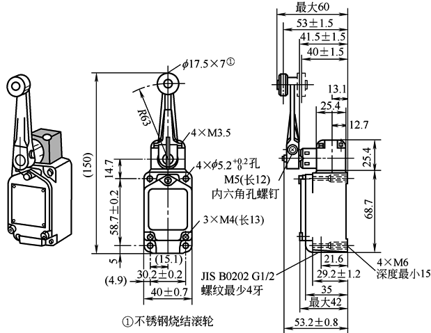表1 滚轮及可变滚轮摆杆型的外形及安装尺寸 mm |