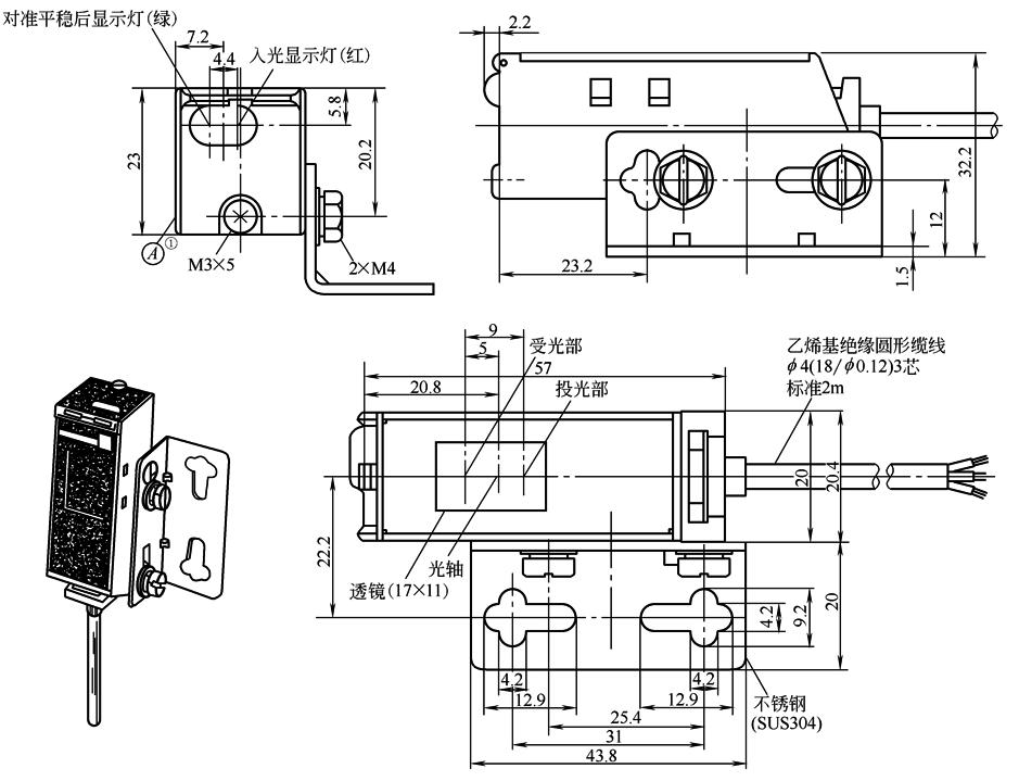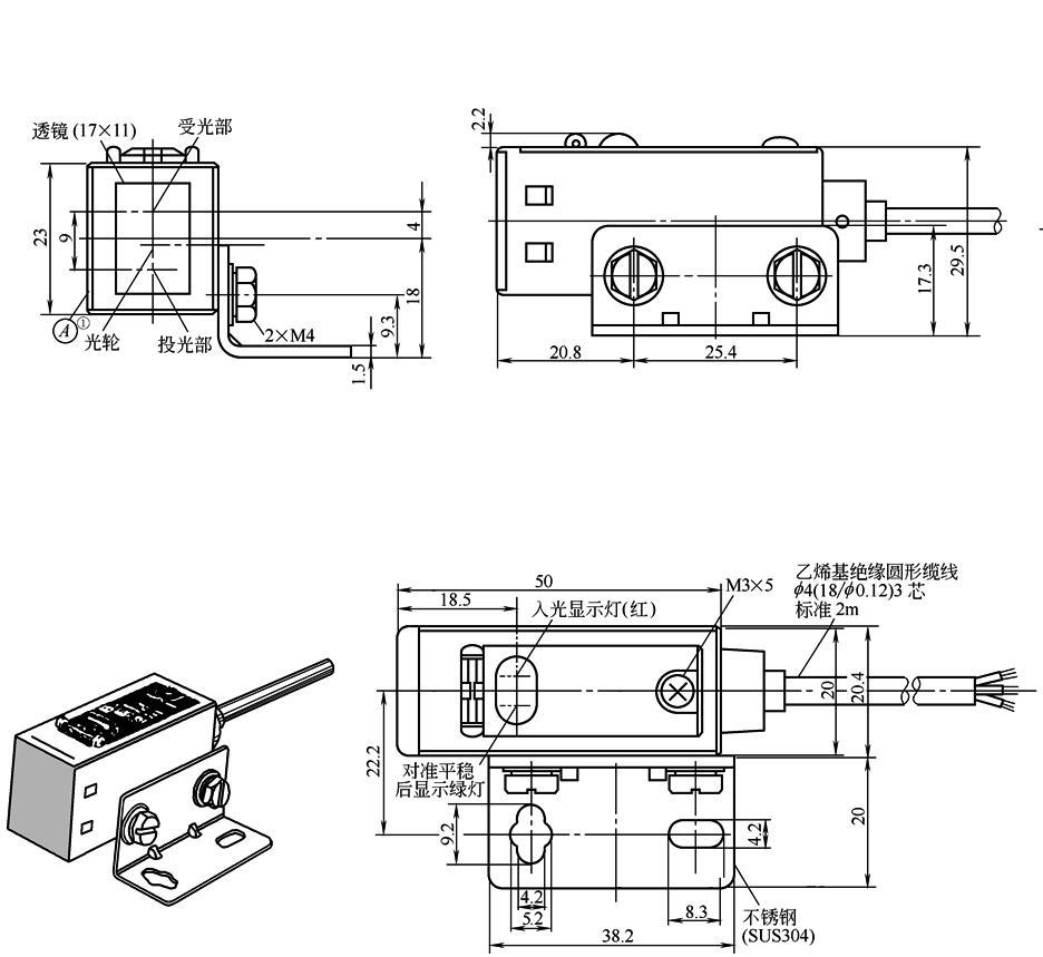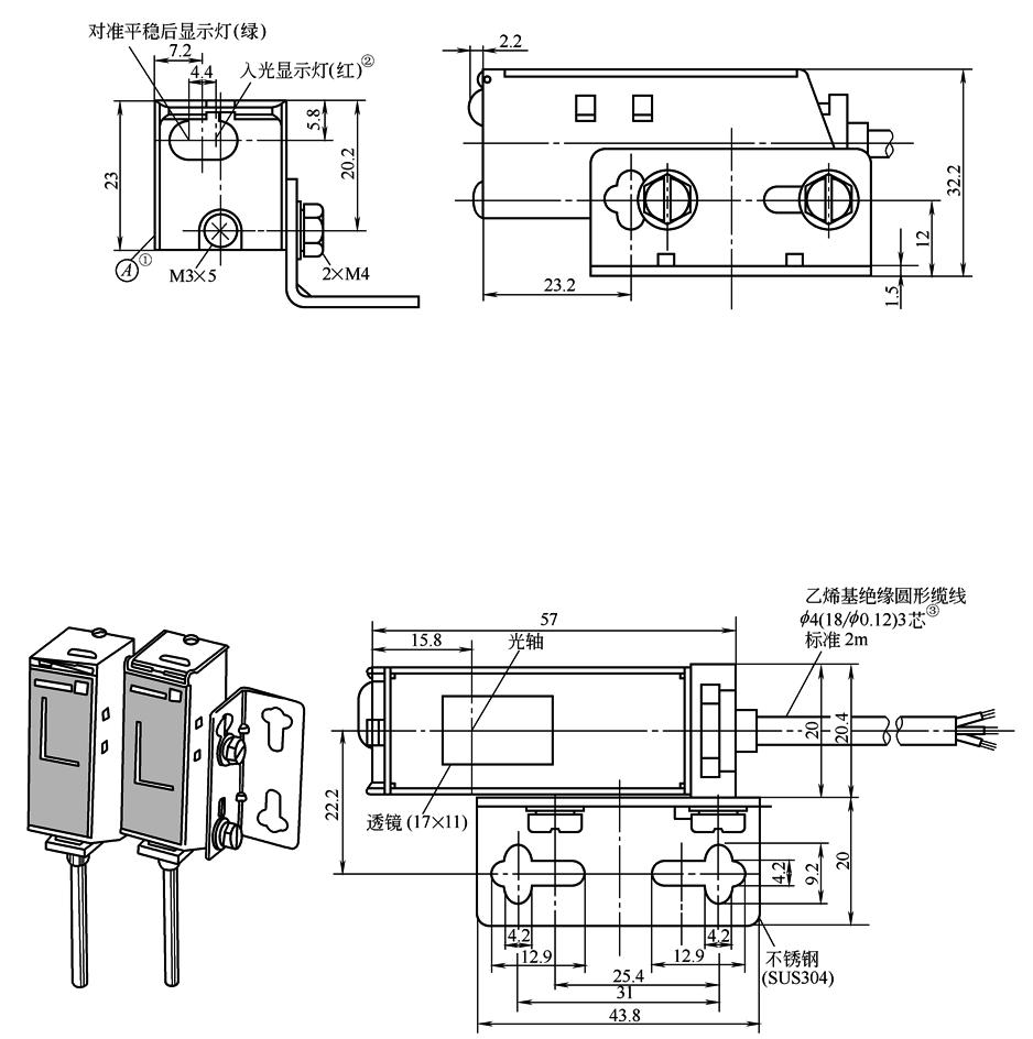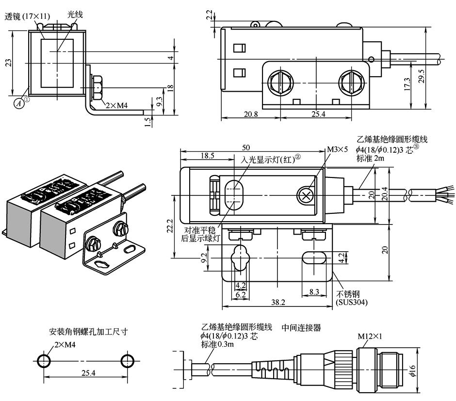 图1 ① ② 对射型的投光器只有电源显示灯(红)。 ③ 对射型的投光器,f 4(27/f 0.12)2芯。