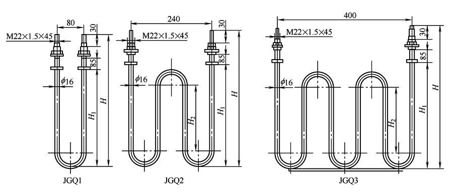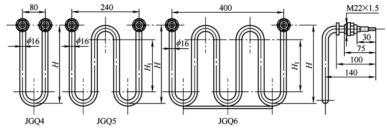 (2) JGQ4,5,6型管状电加热元件 为空气加热元件,适用于干燥箱、烘箱、大型烘炉等,作为各种油漆、绝缘漆等烘干和各种产品的脱水干燥及空气加热等用。最高工作温度不应超过300℃。元件表面涂远红外线涂料。 外形尺寸及主要参数