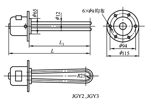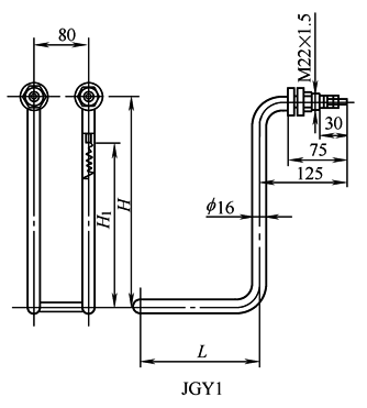 (2) JGY2,3型管状电加热元件 JGY2型是静止油加热元件,最高工作温度不应超过300℃。JGY3型是循环油加热元件,最高工作温度不应超过100℃。一般多安装于化工反应釜及焊有管法兰的容器和设备上。元件表面涂耐热银粉漆。 外形尺寸及主要参数
