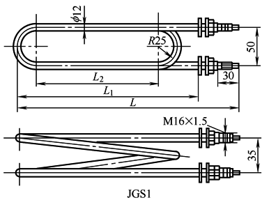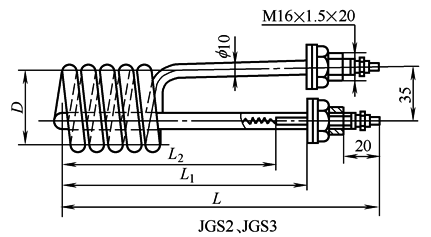 此为水加热元件,适用于敞开式和封闭式的水槽中及循环水系统内加热水用。JGS1型管子材料为10钢,元件表面涂耐热银粉漆。JGS2,3型为紫铜 外形尺寸及主要参数