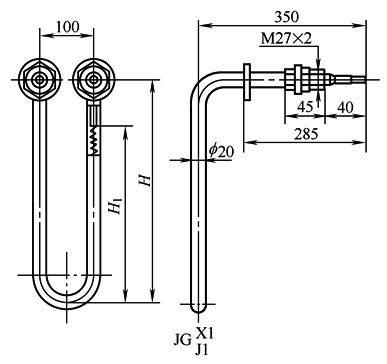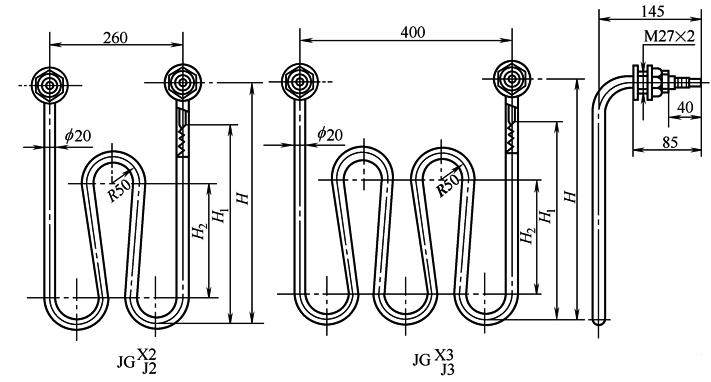 JGX1,2,3型为硝盐加热元件,用于加热硝盐溶液。管子材料为不锈钢,元件表面不处理。JGJ1,2,3型为碱加热元件,用于加热各种碱溶液。管子材料为10钢。JGJ1型元件表面涂耐热银粉漆。JGJ2型、JGJ3型元件表面涂远红外线涂料。两种元件外形尺寸和技术数据相同,工作温度均为500~550℃ 外形尺寸及主要参数
