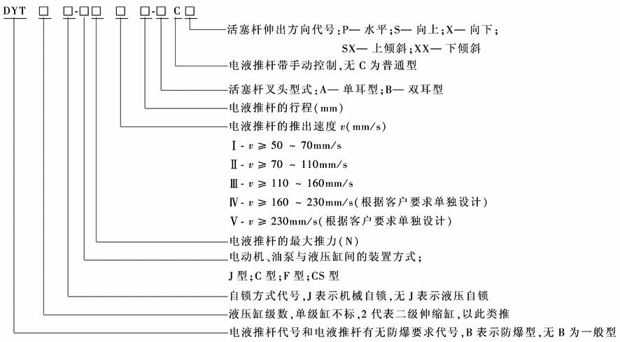 注:1.各种类型的电液推杆如配置传感器和数字显示装置,即可显示运行距离。 2.所有电液推杆可以具备手动装置,技术参数、安装距离一律不变。 3.用户需行程大于表中规定的最大行程时,应通过双方协商解决。 4.用户如需表未列出的推(拉)力、速度时,可按用户要求设计、制造。 5.用户如对外形尺寸、安装方式和尺寸有特殊要求时,可按用户要求设计。 6.用户应按型号表示方法,标明使用要求或在型号外另加说明,电动机由生产厂配套。 型号表示方法
