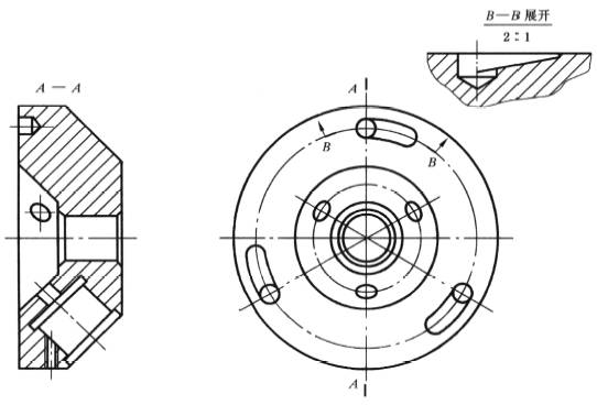 一般用单一剖切平面的剖切机件,也可用单一柱面剖切机件。采用单一柱面剖切机件时,剖视图一般应按展开绘制,图B—B |